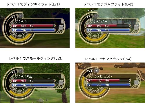 検証方法:新規アカウントを作成し、経験値0の状態からそれぞれのレベル(1~4レベル)を倒し、SSで見比べる