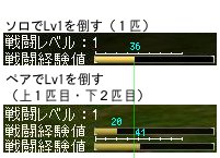 ソロでレベル1を倒したときは36、ペアで倒したときは、1匹目20、2匹目41となりました。